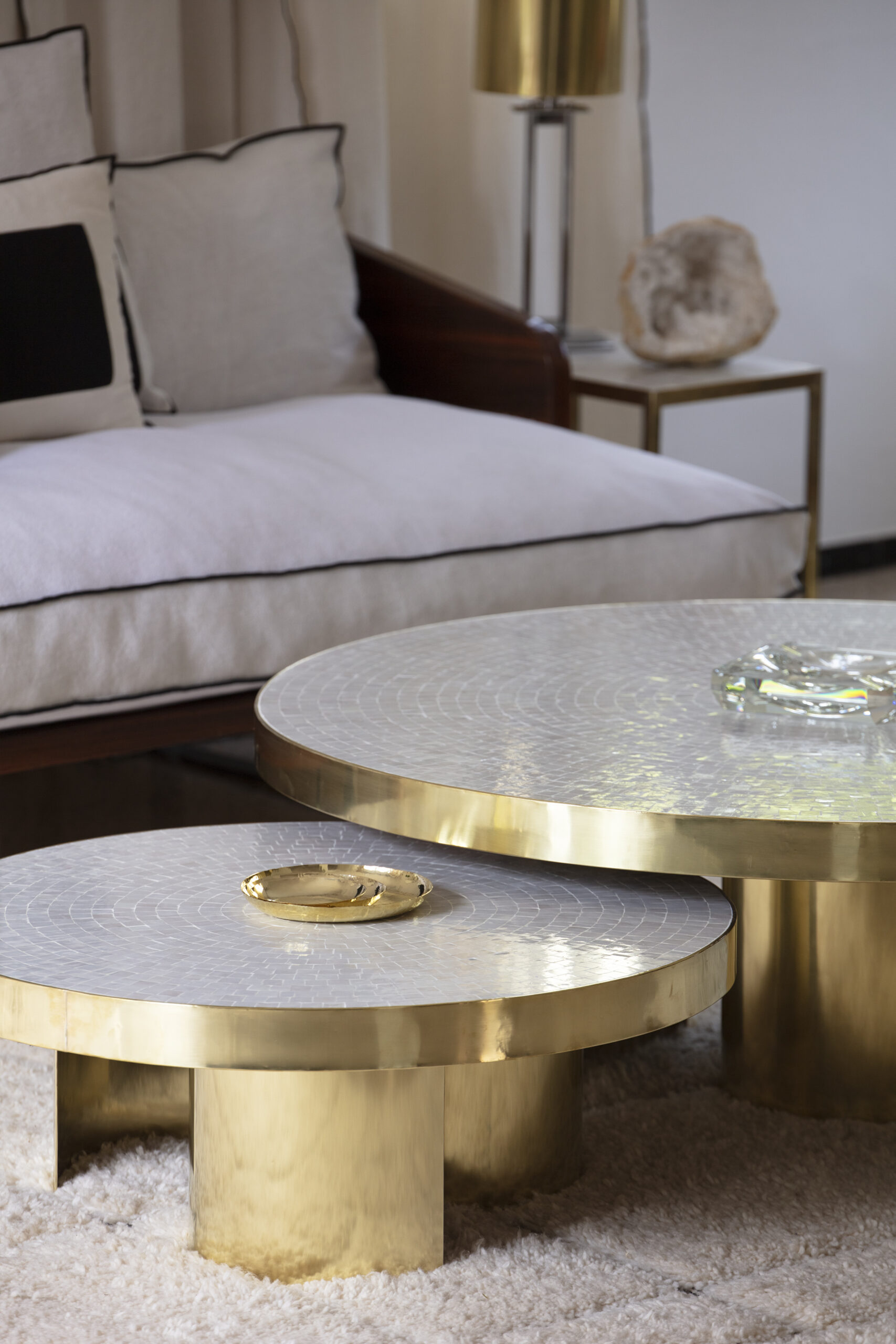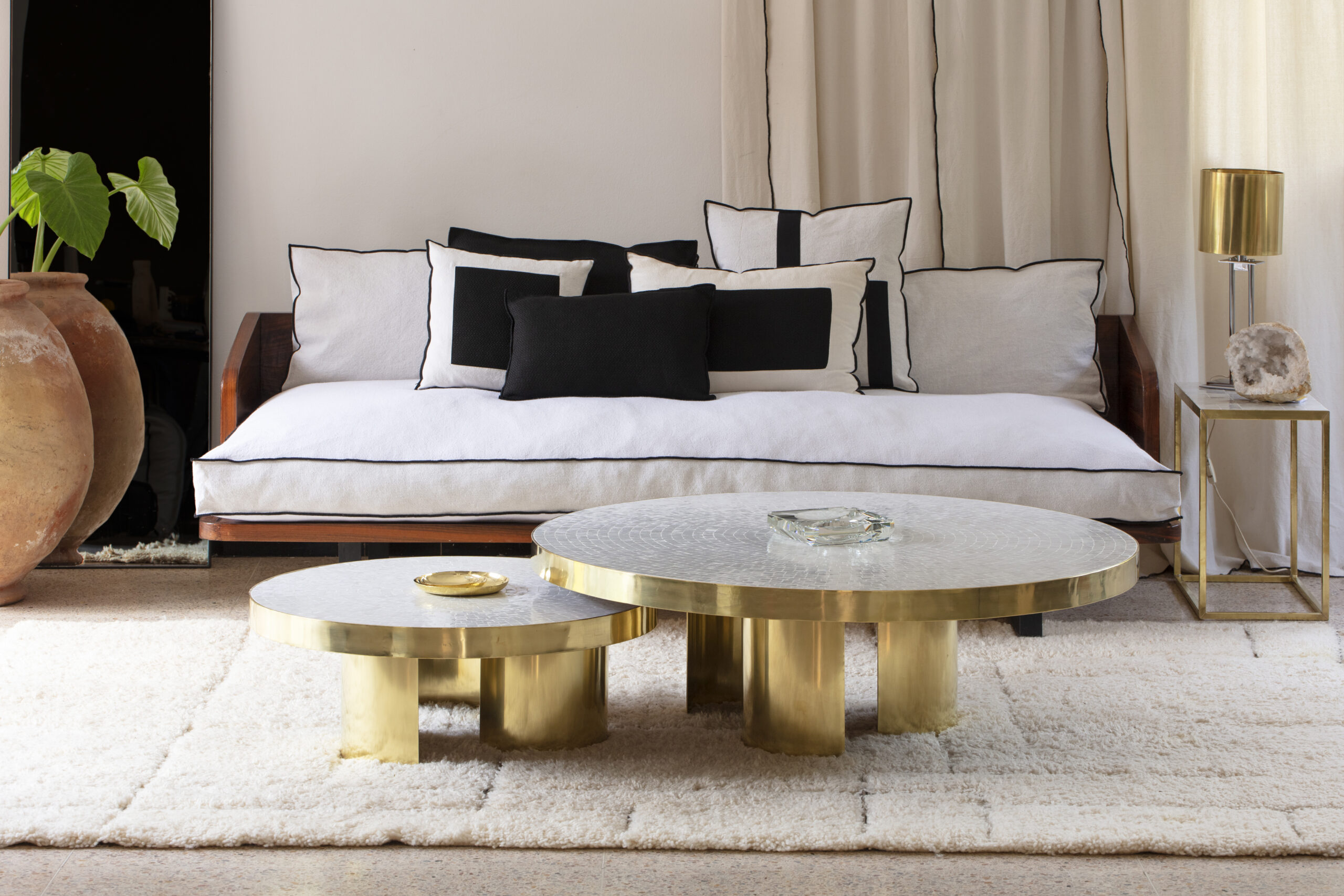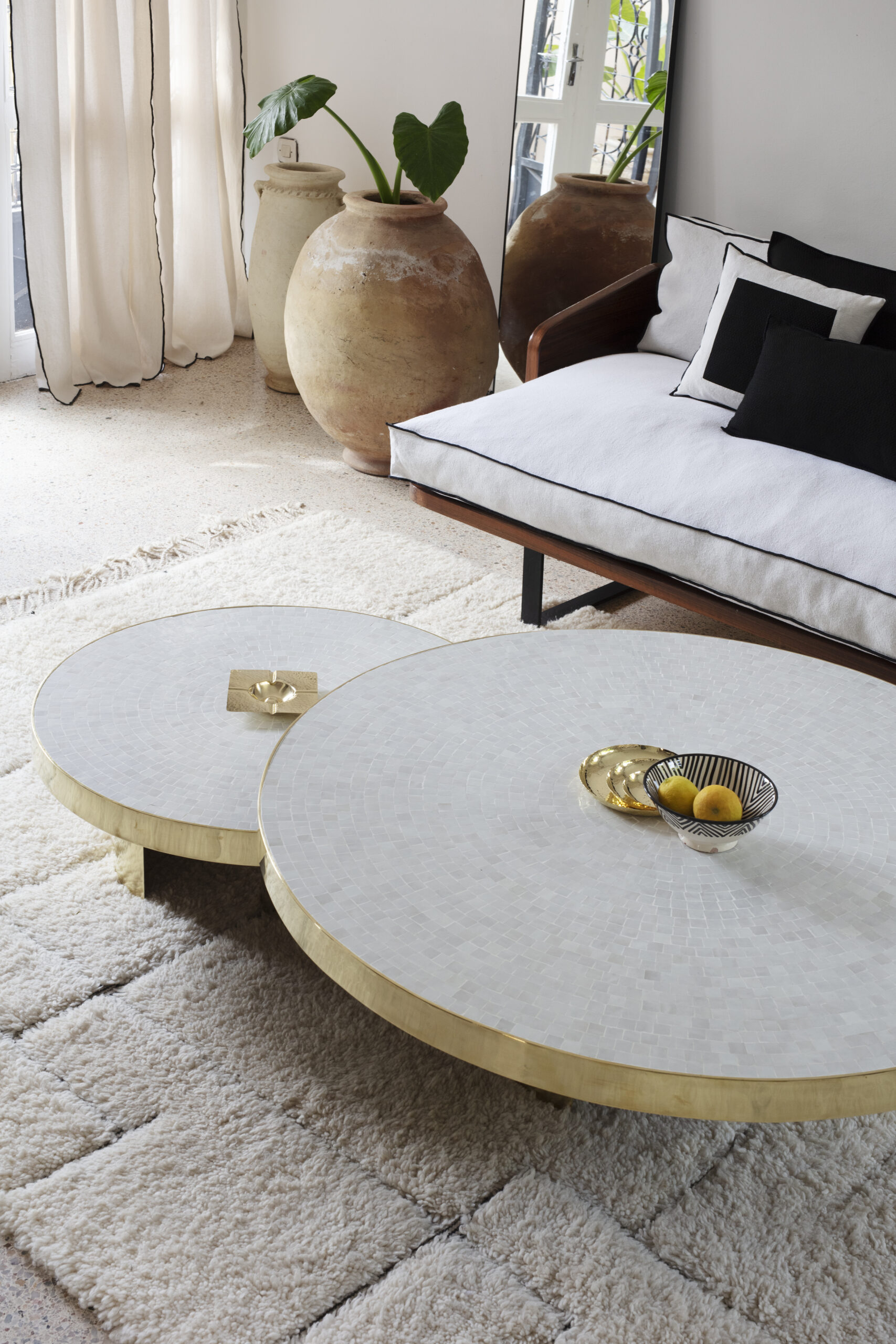 Chaque carreau du plateau est minutieusement travaillé à la main, garantissant un rendu unique et authentique. Les dimensions de la table sont : diamètre 120 cm et hauteur 30 cm. Ces proportions conviennent aussi bien aux grands salons qu’aux espaces plus cosy.