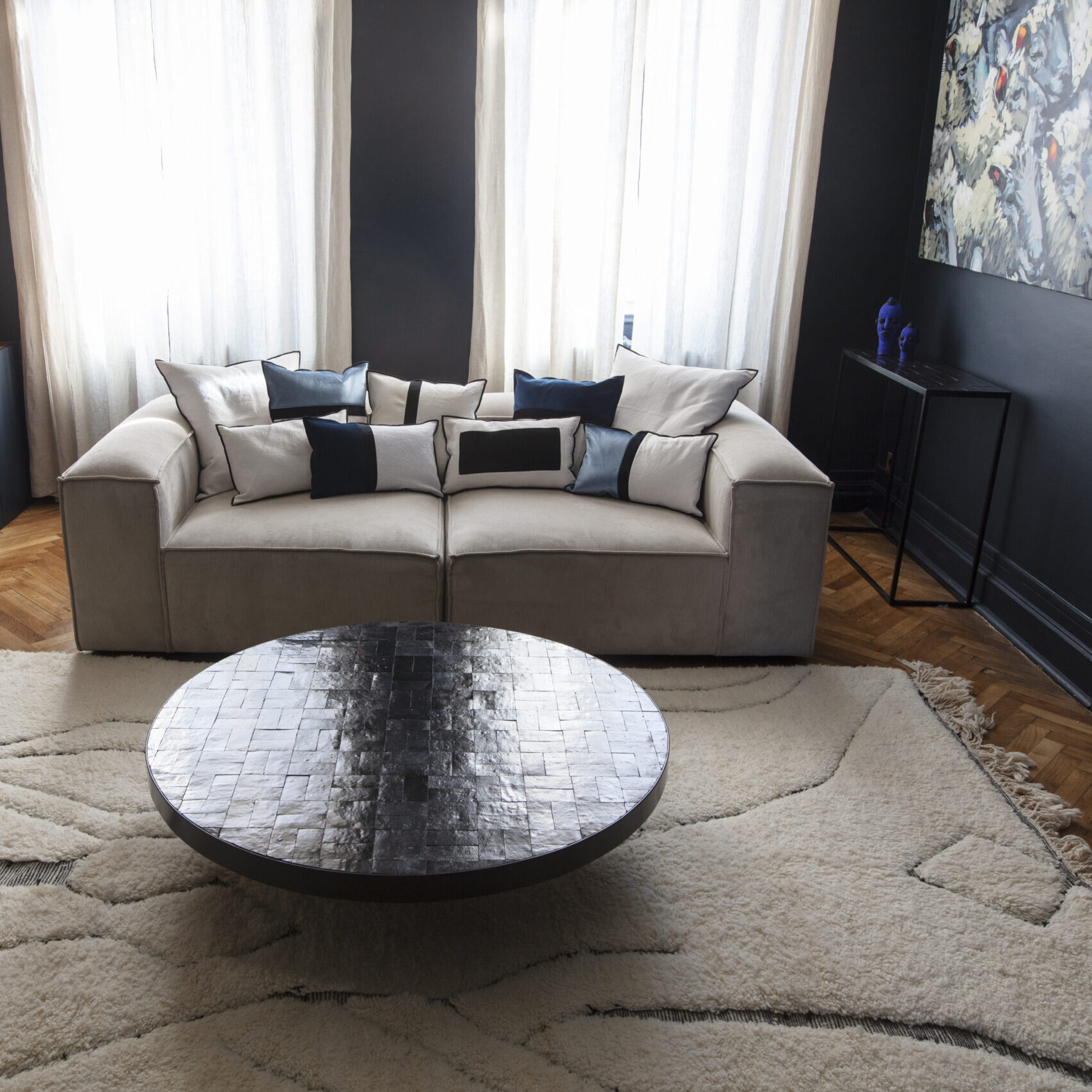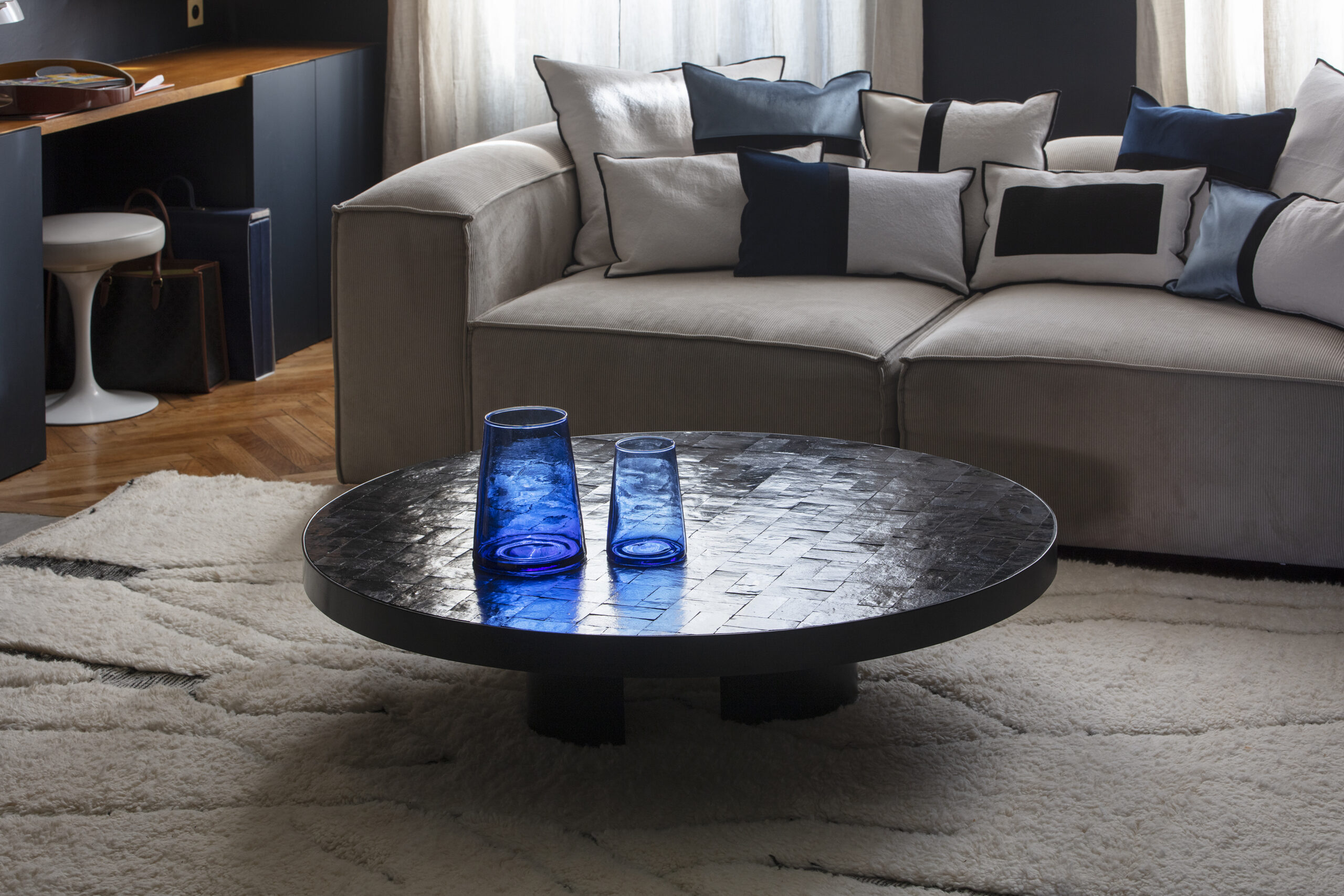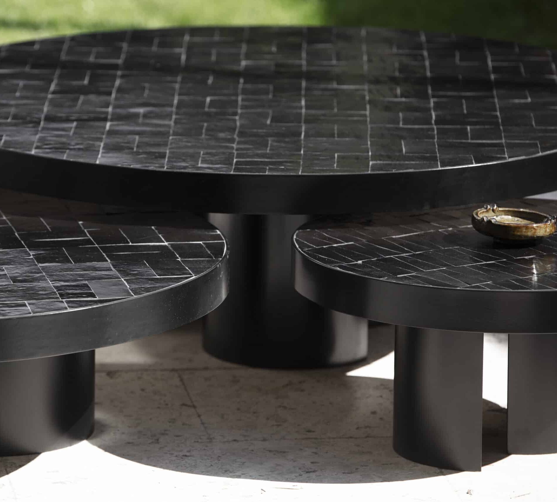 La table basse ronde noire incarne l’alliance parfaite entre artisanat traditionnel et design contemporain. Nos artisans réalisent chaque plateau à partir de carreaux de zellige noir taillés minutieusement à la main. Par conséquent, les légères irrégularités sur chaque surface témoignent d’un travail précis et authentique. Ces variations apportent également une touche décorative et confèrent à la table un charme unique.