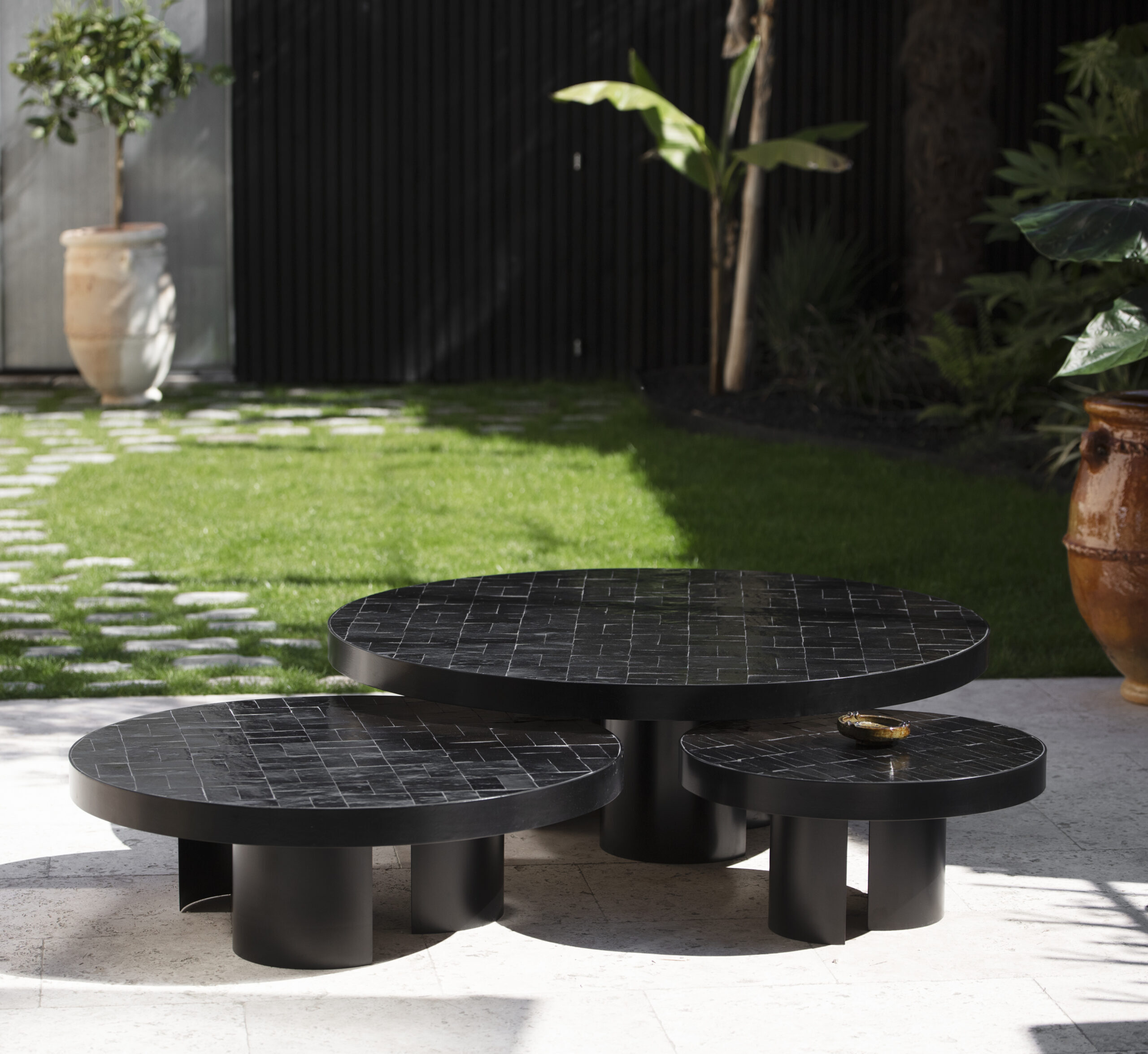 Plateau en zellige noir : matériau traditionnel du Maroc, offrant des nuances subtiles et un rendu authentique.